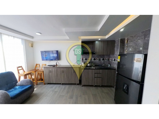 Apartamento de 47m2 con sala comedor, cocina integral, zona de lavandería, dos habitaciones auxiliares, baño social completo, habitación principal con baño