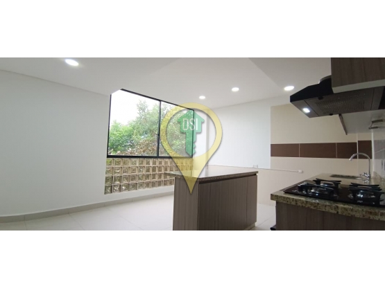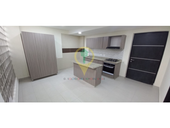 Sala comedor, cocina con isla y punto para lavadora, habitación con baño privado
