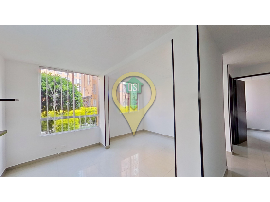 Apartamento de 53m2 con sala comedor, cocina integral con zona de lavandería, patio, estudio hall de alcobas, habitación auxiliar con clóset, baño social completo, alcoba principal con clóset y baño privado