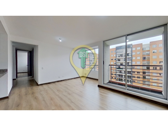 Apartamento de 73m2 en noveno piso con sala comedor con balcón, cocina integral, zona de lavandería con calentador a gas, hall de alcobas, espacio amplio para estudio, baño social completo, dos habitaciones auxiliares con clóset, habitación principal con closet en L y baño privado